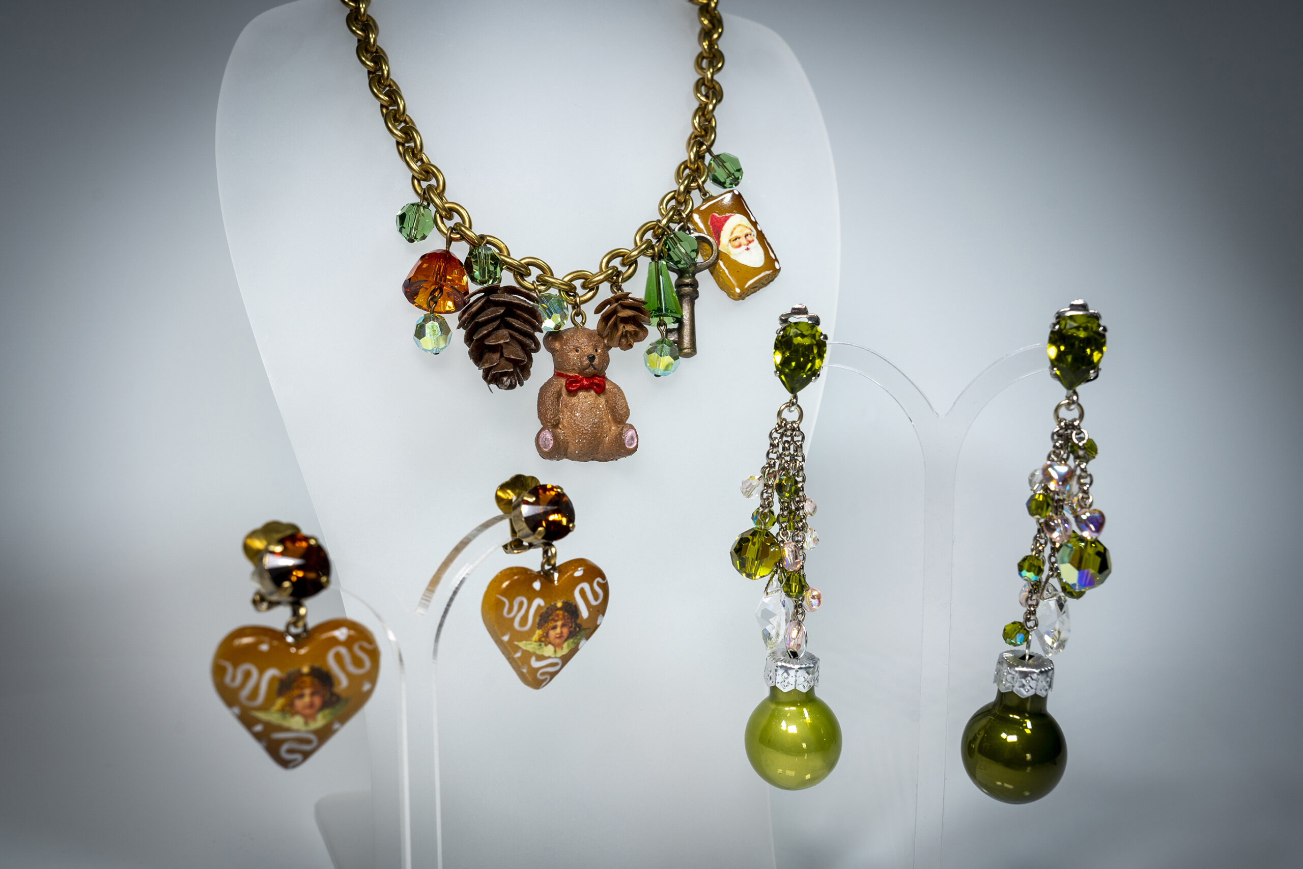 Und ein echter Eyecatcher. Strahlen Sie mit Weihnachtsschmuck. Sterne, Schneeflocken, Tannenbäumchen, Nikoläuse, Christkinder oder Engelchen glitzern als Ohrringe, Anstecker, Broschen und Ketten – handgefertigt von Veronika Wentz und Pragin.